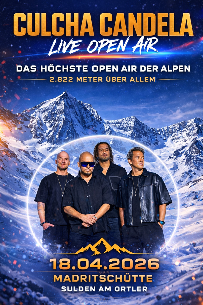 Ein Konzert auf 2.820 Metern Höhe: Beim „Live Open Air 2026“ wird die Madritschhütte in Sulden zur außergewöhnlichen Bühne inmitten der Ortlergruppe. Für den musikalischen Auftakt sorgt DJ Niedex, bevor Culcha Candela mit ihrer energiegeladenen Live-Show den Saisonabschluss einläuten. Die Kombination aus alpinem Panorama und Live-Musik macht die Veranstaltung zu einem besonderen Erlebnis.