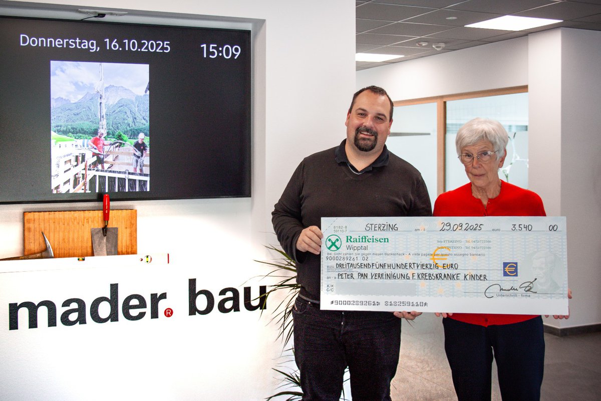 Zum 10-jährigen Firmenjubiläum lud die Firma Mader Mitarbeiter, Kunden und Partner zu einer gemeinsamen Feier ein. Im Rahmen des Events wurde eine Spendenaktion für Peter Pan, die Kinderkrebshilfe Südtirol, organisiert. In einer eigens aufgebauten Spendenbox kamen dank zahlreicher Beiträge 1.770 Euro zusammen – die Firma Mader verdoppelte den Betrag und übergab schließlich 3.540 Euro an den guten Zweck.